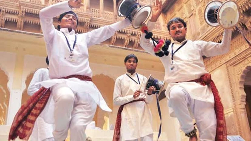 While the main stage of the Mehrangarh Fort was thronged by revellers at night, the many interior pockets of the citadel threw up vibrant surprises during the day. Visitors to the fort museum along with RIFF attendees are witness to the 'Fort Festivities' section of the festival, which comprises traditional dance forms such as the dhol thali nritya, dance of the Algoza party and the derun dance - all performed by men.