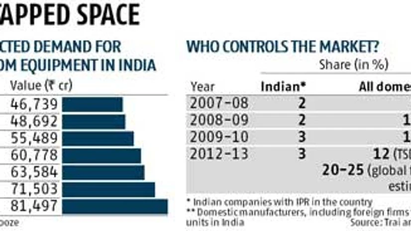 According to the Telecom Systems Design and Manufacturing Association (TSDMA), Indian firms that design and manufacture and also have intellectual property, had a three per cent share of the nearly-Rs 50,000-crore telecom equipment market in 2012-13. Adding foreign companies that have factories in India raises the share to 10-12 per cent.