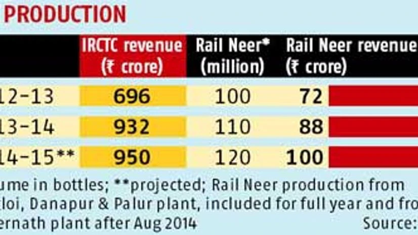 IRCTC's four Rail Neer plants - at Nangloi, Danapur, Palur and Ambernath - have a combined capacity of about 610,000 litres of packaged drinking water a day, compared with a total requirement of 2.5 million litres on trains and railway stations. These plants do not run full capacity, though. Besides, the biggest Rail Neer plant at Ambernath, with a capacity of 200,000 litres a day, was added only last year. "We are constrained more by supply than demand," said the IRCTC official. According to the company's estimates, India's market for packaged drinking water has doubled to about 10 billion litres a year since 2004, when it was estimated to be five billion litres. Bisleri is the market leader; Aquafina and Kinley are the next biggest.