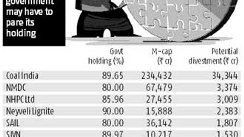 Some of the major companies where the government will have to divest to bring down its holding to 75 per cent include Coal India (where it will have to sell shares worth Rs 34,000 crore at the current market rate), NMDC (Rs 3,373 crore) and NHPC (Rs 3,009 crore).