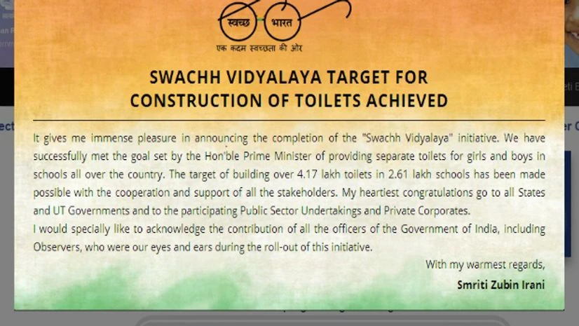 A visit to the Swachh Vidyalaya website on Independence Day, one is greeted with a congratulatory message on the completion of the Swachh Vidyalaya (SV) campaign (launched to ensure toilets including separate ones for girls in all schools). The message is accompanied with a bar measuring 100% completion rate of a target of constructing 4.17 lakh toilets in 2.61 lakh schools across the country.