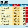 At the beginning of 2014, the four major players in the multiple-screen theatres business were PVR (408 screens), Inox (296), Big Cinemas (254) and Cinepolis (100). By the end of the year, while PVR and Inox held on to their top ranks, Kerala-based Carnival Cinemas had cruised its way to the third spot, having added nearly 260 screens after acquiring Anil Ambani's Big Cinemas and HDIL's Broadway Cinema. And though Cinepolis too had bought out Subhash Chandra's Fun Cinemas, it had to be content at a place below Carnival.