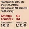 Angry investors sold Ambuja and ACC shares on the stock exchange as soon as the markets opened for business on Thursday. The Ambuja stock recovered from a 15 per cent fall to close with a 10.52 per cent decline — its biggest single-day fall since 1991. ACC fell three per cent to close at Rs 1,194.