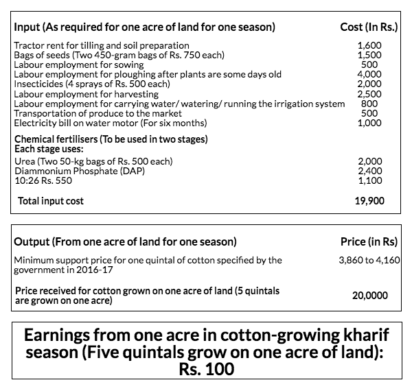 Once Ukarde has accounted for the cost of seeds, fertilisers, pesticides, water, equipment and labour costs and deducted that from the price per quintal he will earn from selling cotton and green and black gram on his three-acre farm, he has about Rs 1,000 left in hand per year. This includes the income from wheat and jowar that he cultivates on the same patch of land in the rabi season.