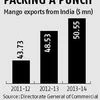 In 2013-14, India exported mangoes worth Rs 5,022 lakh (3,933 tonnes) as against Rs 3,559 lakh in 2012-13 (3,890 tonnes).