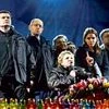 Earlier, coffins - some of them open showing the victim face up - were displayed in front of the crowd as priests said prayers. People crossed themselves in front of makeshift shrines with candles and pictures of the dead. Two captured water cannon trucks were parked in the square, like trophies of war.
