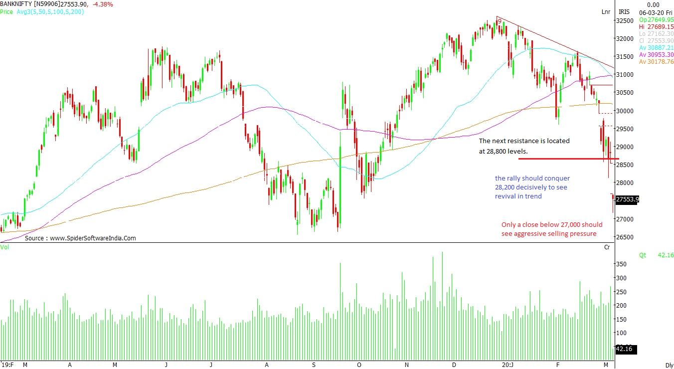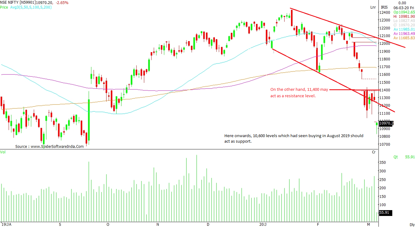NIFTY 50: The index broke the major level of 11,000 in Friday trade. A cut of nearly 4 per cent in an intra-day shows weakening of an upward bias. Here onwards, 10,600 levels which had seen buying in August 2019, should act as support. On the other hand, 11,400 may act as a resistance level. CLICK HERE FOR THE CHART