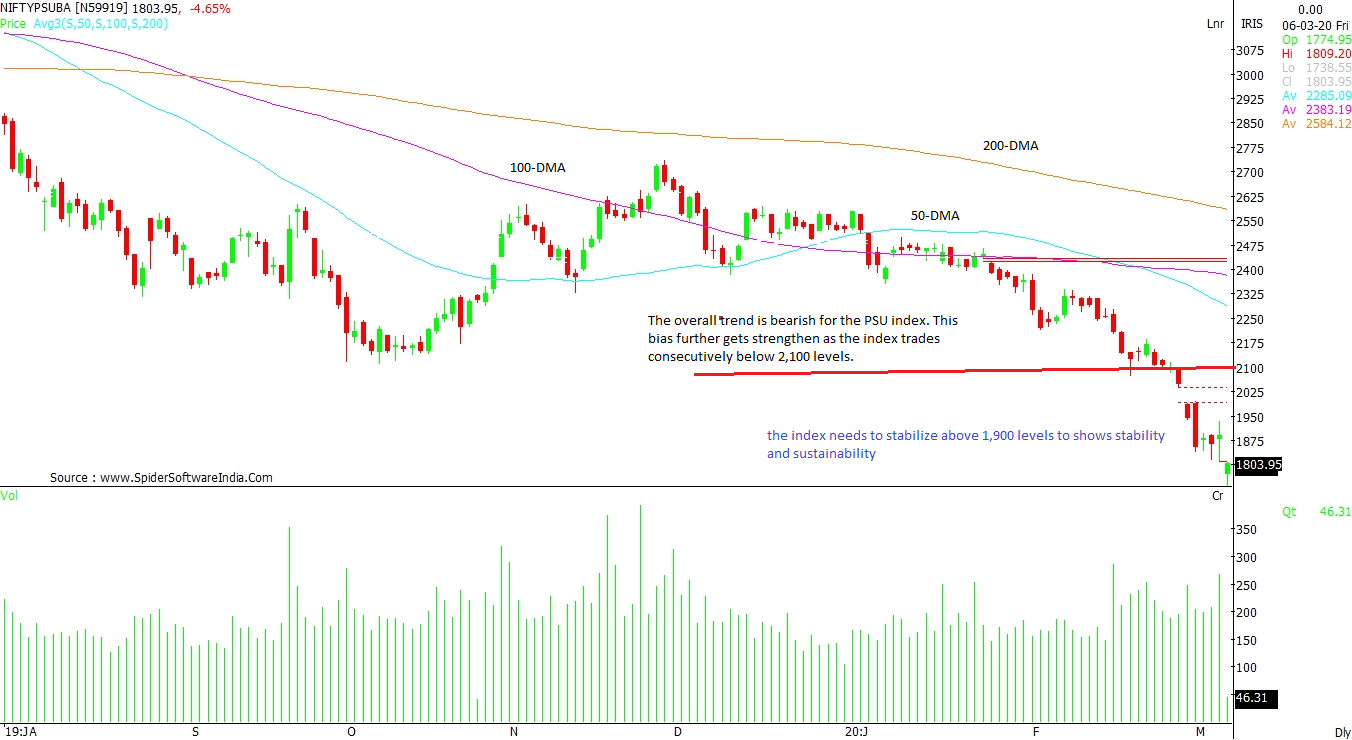 NIFTY PSU BANK: The overall trend is bearish for the Nifty PSU Bank index. This bias further gets strengthened as the index trades consecutively below 2,100 levels. A new lifetime low of 1,738 suggests the revival in trend is a remote possibility. Going forward, the index needs to stabilise above 1,900 level to show some stability and sustainability. Until then, staying cautious seems a viable option. CLICK HERE FOR THE CHART
