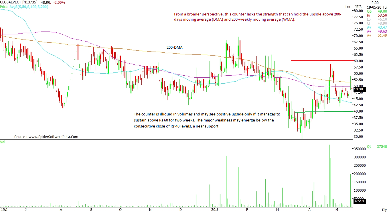 Global Vectra Helicorp Limited (GLOBALVECT): From a broader trading perspective, this counter lacks the strength that can trigger an upside above 200-days moving average (DMA) and 200-weekly moving average (WMA). Everytime it attempts to cross these averages, a sudden selling pressure pushes the price downward. The counter is illiquid and may see an upside only if it manages to sustain above Rs 60 for two weeks. A major weakness may emerge below if the counter sees consecutive close below Rs 40 levels, which is a near support for this stock. CLICK HERE FOR THE CHART