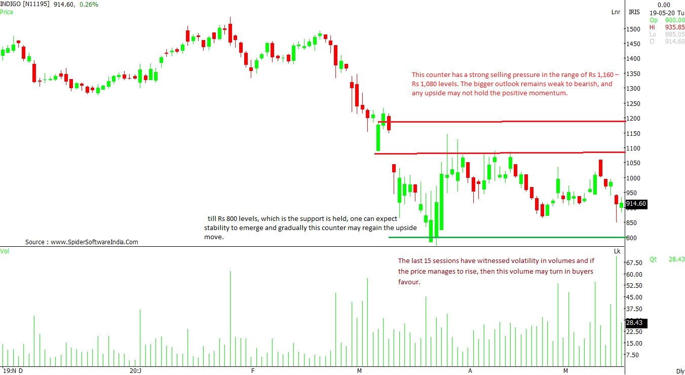 InterGlobe Aviation Ltd (INDIGO): This stock faces a strong selling pressure in the range of Rs 1,160 – Rs 1,080 levels. The bigger outlook remains weak and any upside may not hold for long. As per the daily chart, the counter has been unable to hold on to higher levels, but a sharp fall below Rs 800 levels, which is the supportis ruled out for now. The last 15 sessions have seen volatility in volumes and if the price manages to rise over the next few sessions, then it may also find volume support. CLICK HERE FOR THE CHART