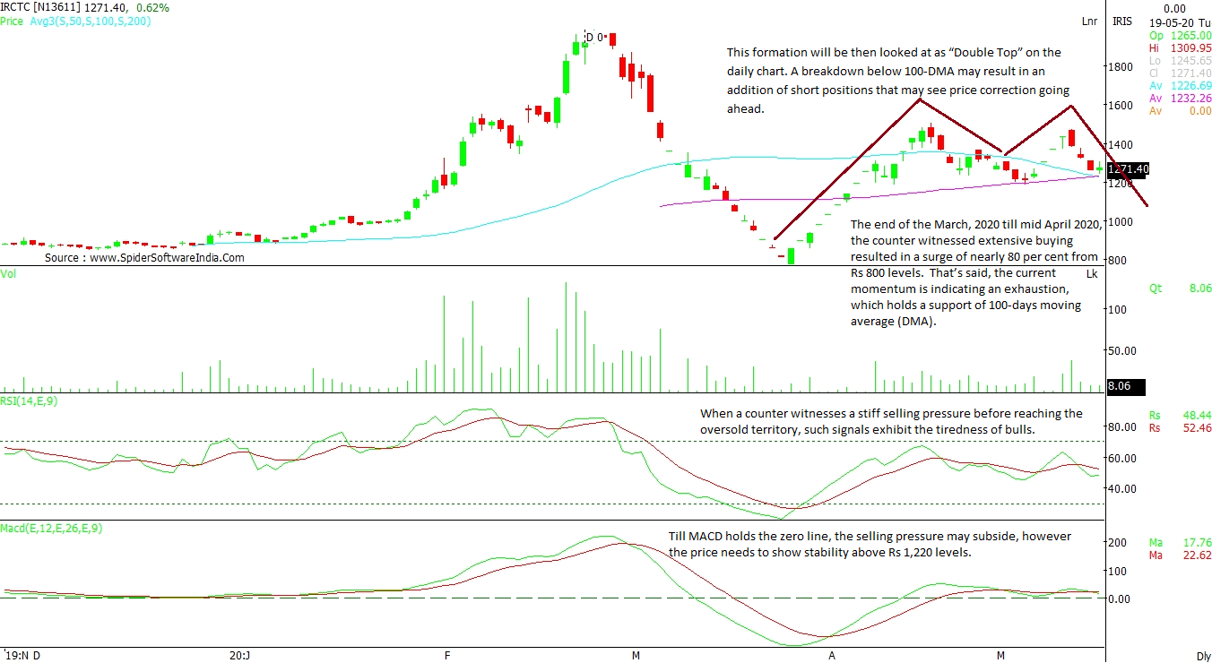 Indian Railway Ctrng nd Trsm Corp Ltd (IRCTC): The stock witnessed a rally of around 80 per cent from its March 2020 low of Rs 800 levels till mid April 2020. Given suhc a massive move, the counter is now showing signs of exhaustion, but is holding on to the support of 100-days moving average (DMA). Going forward, if the counter breaks the 100-DMA placed at Rs 1,220 then a selling may intensify and can tarke the stock towards Rs 1,000 levels. The current formation indicates a “Double Top” on the daily chart. A breakdown may result in an addition of short positions, which may see a price correction going ahead.