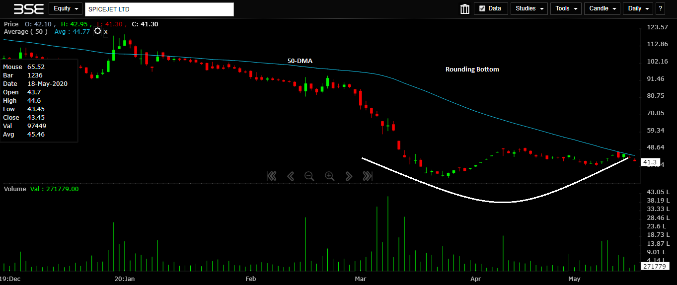 SpiceJet Ltd (SPICEJET): A rounding bottom formation could be formed in the sessions ahead, indicates daily chart. This can be possible if the stock is able to stay above its support of Rs 38. On the upside, the breakout neckline is placed at Rs 50 levels. The current momentum indicates that the counter is attempting to cross 50-DMA place at Rs 44.75 levels. The volumes have remained stagnant; price may see upside if the volumes support and gradually rise over time. CLICK HERE FOR THE CHART