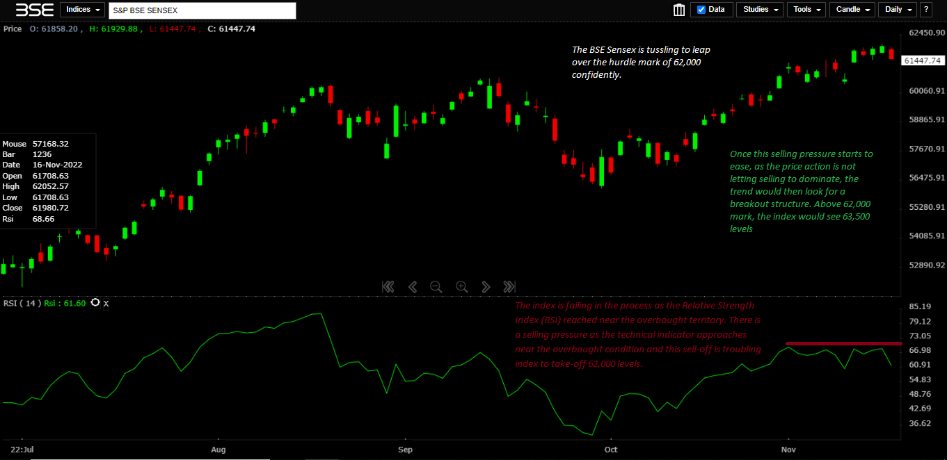 The BSE Sensex is tussling to leap over the hurdle mark of 62,000 confidently. The index is failing in the process as the Relative Strength Index (RSI) has reached near its overbought territory. There is a selling pressure as the technical indicator approaches near the overbought condition, and this sell-off is troubling index to take-off the 62,000 level.