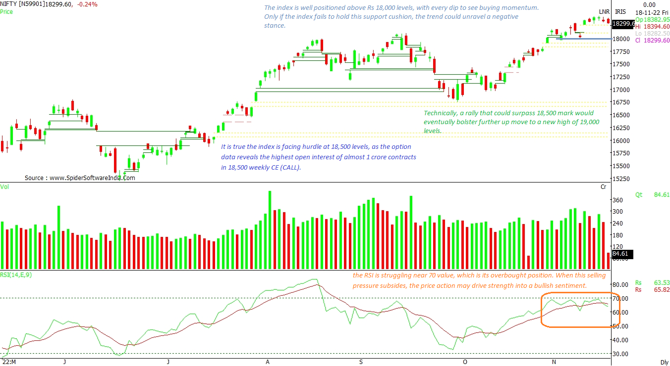 The index is well positioned above the 18,000-mark, with every dip getting absorbed owing to buying momentum. Only if the index fails to hold this support cushion, the trend could unravel a negative stance. For now, the index seems to be facing hurdle at 18,500, as the option data reveals the highest open interest of almost 1 crore contracts at the 18,500 CE (CALL).