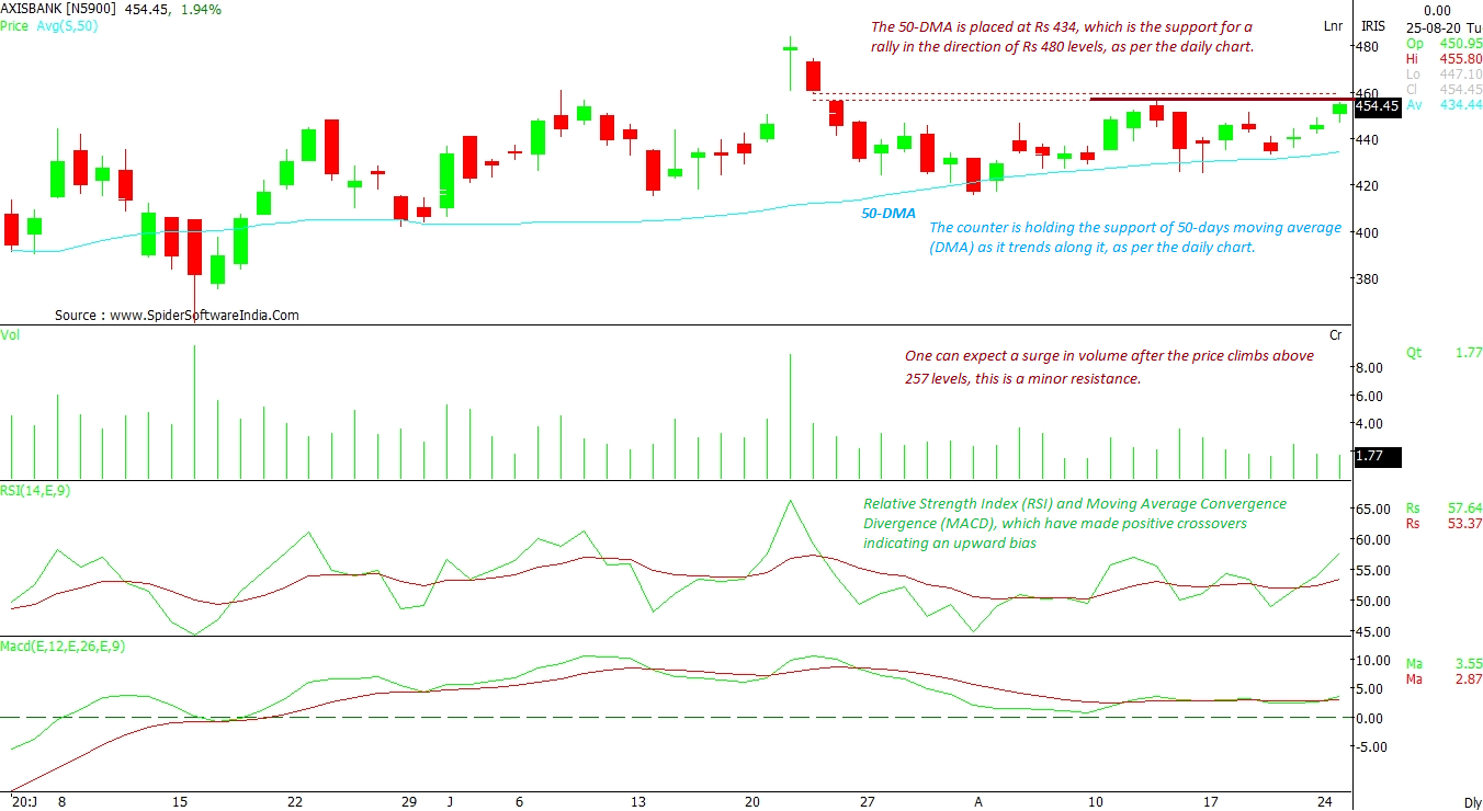 Axis Bank Ltd (AXISBANK): The counter is holding the support of 50-day moving average (DMA), as per the daily chart. This scenario is accompanied by the Relative Strength Index (RSI) and Moving Average Convergence Divergence (MACD), which have made positive crossovers, indicating an upward bias. The 50-DMA is placed at Rs 434, which is the support for a rally in the direction of Rs 480 levels, as per the daily chart. One can expect a surge in volume after the price climbs above Rs 257 levels - a minor resistance level. CLICK HERE FOR THE CHART