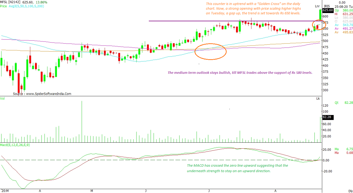 Max Financial Services Ltd (MFSL): This counter is in uptrend with a “Golden Cross” formation on the daily chart. Now, a strong opening with price scaling higher highs on Tuesday (a gap up), the trend is set towards Rs 650 levels. The MACD has crossed the zero line upward suggesting that the underneath strength will stay on an upward direction. The medium term outlook stays bullish, till the counter trades above the support of Rs 580 levels. CLICK HERE FOR THE CHART