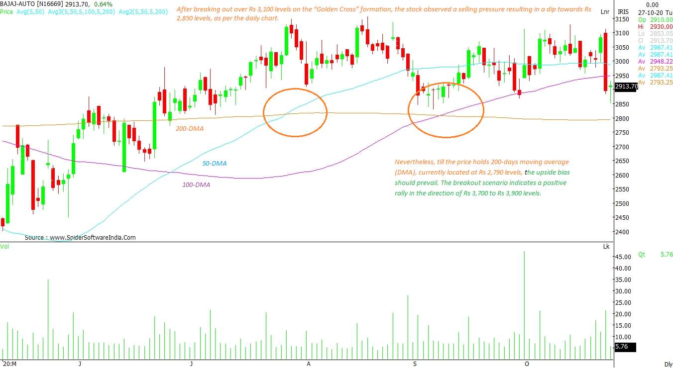Bajaj Auto Ltd (BAJAJA-AUTO): After a break-out above Rs 3,100 levels on the "Golden Cross" formation, the stock came under selling pressure, resulting in a dip towards Rs 2,850 levels, daily chart shows. That said, till the price stays above 200-days moving average (DMA), currently located at Rs 2,790 levels, the upside bias should prevail. The breakout scenario indicates a positive rally in the direction of Rs 3,700 to Rs 3,900 levels. CLICK HERE FOR THE CHART