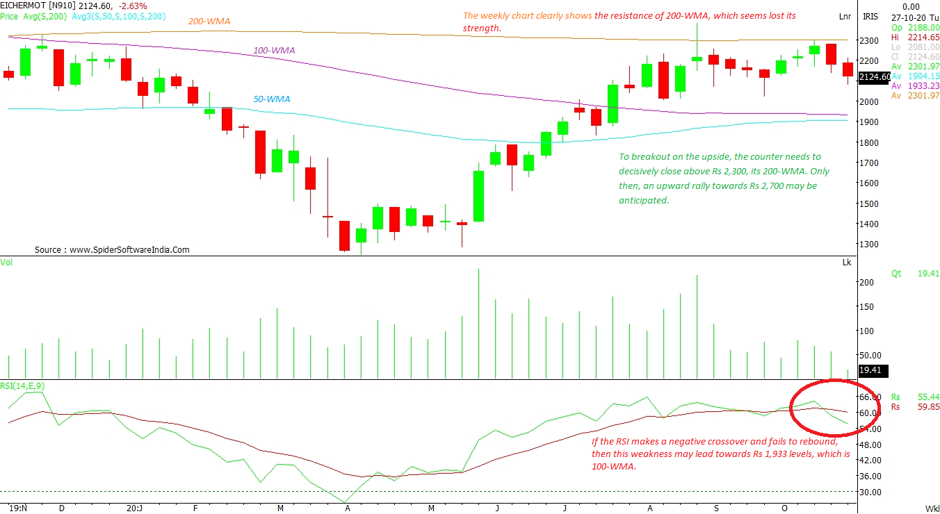 Eicher Motors Ltd (EICHERMOT): The weekly chart clearly shows the resistance of 200-WMA, which hints at consistent weakening of strength. If the RSI makes a negative crossover and fails to rebound, then the weakness may drag the stock towards Rs 1,933 levels, which is also its 100-WMA. In order to clock a meaningful rally, the counter needs to decisively close above its 200-WMA, placed at Rs 2,300. A breakout above it may lead the stock towards Rs 2,700 levels. CLICK HERE FOR THE CHART