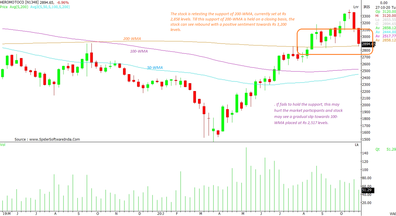 Hero MotoCorp Ltd (HEROMOTOCO): The stock is re-testing the support of 200-WMA, currently set at Rs 2,858 levels. Till this support of 200-WMA is held on a closing basis, the stock can see rebound with a positive sentiment towards Rs 3,200 levels. Any failure to hold the support may hurt the market participants and stock may see a gradual slip towards 100-WMA placed at Rs 2,517 levels. CLICK HERE FOR THE CHART