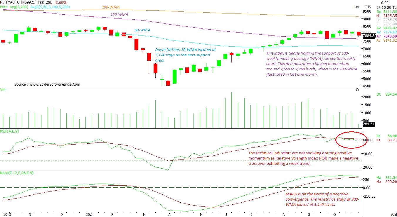 NIFTYAUTO: The index is holding the support of 100-weekly moving average (WMA), as per weekly charts. This demonstrates buying momentum around 7,650 to 7,750 levels, where the 100-WMA fluctuated in the previous month. On the downside, 50-WMA is placed at 7,174, which will act as the next support area. The technical indicators are not showing a strong positive momentum as Relative Strength Index (RSI) -- a metric to gauge bullish or bearish price momentum -- made a negative crossover exhibiting a weak trend. The Moving Average Convergence Divergence (MACD), too, is on the verge of a negative convergence. Key resistance for the index is placed at 200-WMA at 9,140 levels. CLICK HERE FOR THE CHART