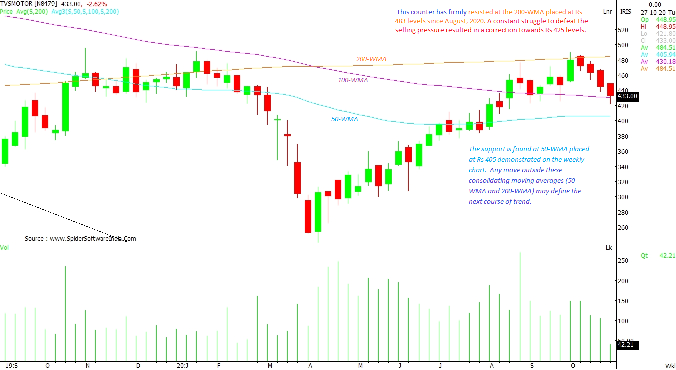 TVS Motor Company Limited (TVSMOTOR): The counter is witnessing firm resistance at the 200-WMA placed at Rs 483 levels since August, 2020. A constant struggle to defeat the selling pressure resulted in a correction towards Rs 425 levels. The support now is found at 50-WMA placed at Rs 405, as per weekly chart. Any move outside these consolidating moving averages (50-WMA and 200-WMA) may define the next course of trend.. CLICK HERE FOR THE CHART