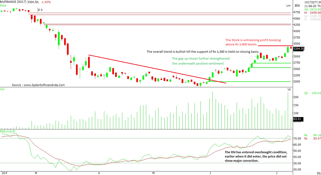 CLICK HERE FOR THE CHART Bajaj Finance Ltd (BAJFINANACE): The stock is witnessing profit booking above Rs 3,400 levels. The RSI has entered overbought condition. Earlier when it did enter thiz zone, Bajaj Finance did not show any major correction. The overall trend is bullish till the support of Rs 3,300 is held on a closing basis. The gap-up closes further hint at the underlying positive sentiment.