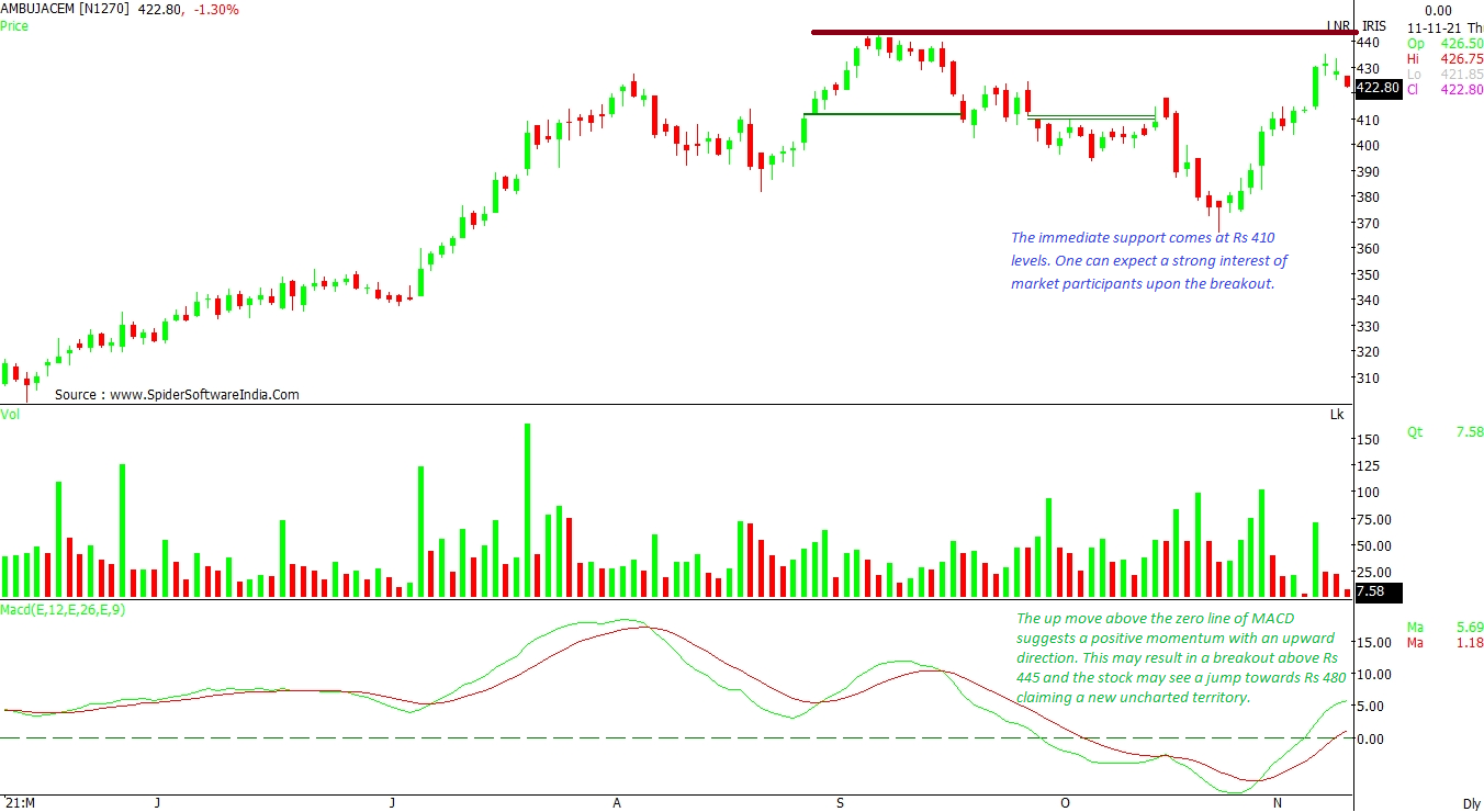 The up move above the zero line of MACD suggests a positive momentum with an upward direction, as per the daily chart. This may result in a breakout above Rs 445 and the stock may see a jump towards Rs 480 claiming a new uncharted territory. The immediate support comes at Rs 410 levels. One can expect a strong interest of market participants upon the breakout. CLICK HERE FOR THE CHART