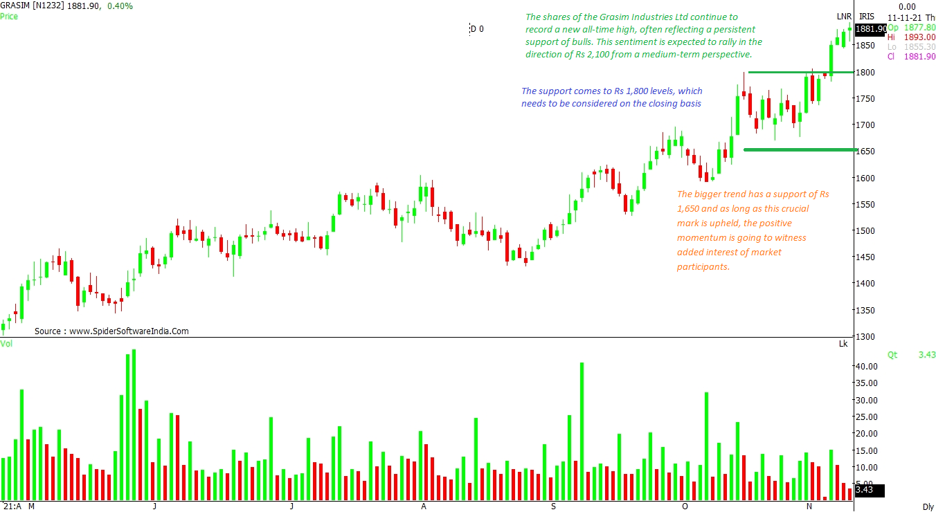The shares of the Grasim Industries Ltd continue to record a new all-time high, often reflecting a persistent support of bulls. This sentiment is expected to trigger a rally in the direction of Rs 2,100 from a medium-term perspective. The support comes at Rs 1,800 levels, which needs to be considered on the closing basis, as per the daily chart. The bigger trend has a support of Rs 1,650 and as long as this crucial mark is upheld, the positive momentum is going to witness added interest of market participants. CLICK HERE FOR THE CHART