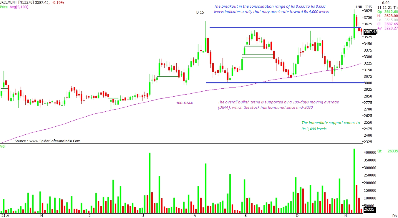 The breakout from the consolidation range of Rs 3,600 to Rs 3,000 levels indicates a rally that may accelerate toward Rs 4,000 levels, as per the daily chart. The overall bullish trend is supported by the 100-day moving average (DMA), which the stock has honoured since mid-2020. The immediate support for the stock comes to Rs 3,400 levels. CLICK HERE FOR THE CHART