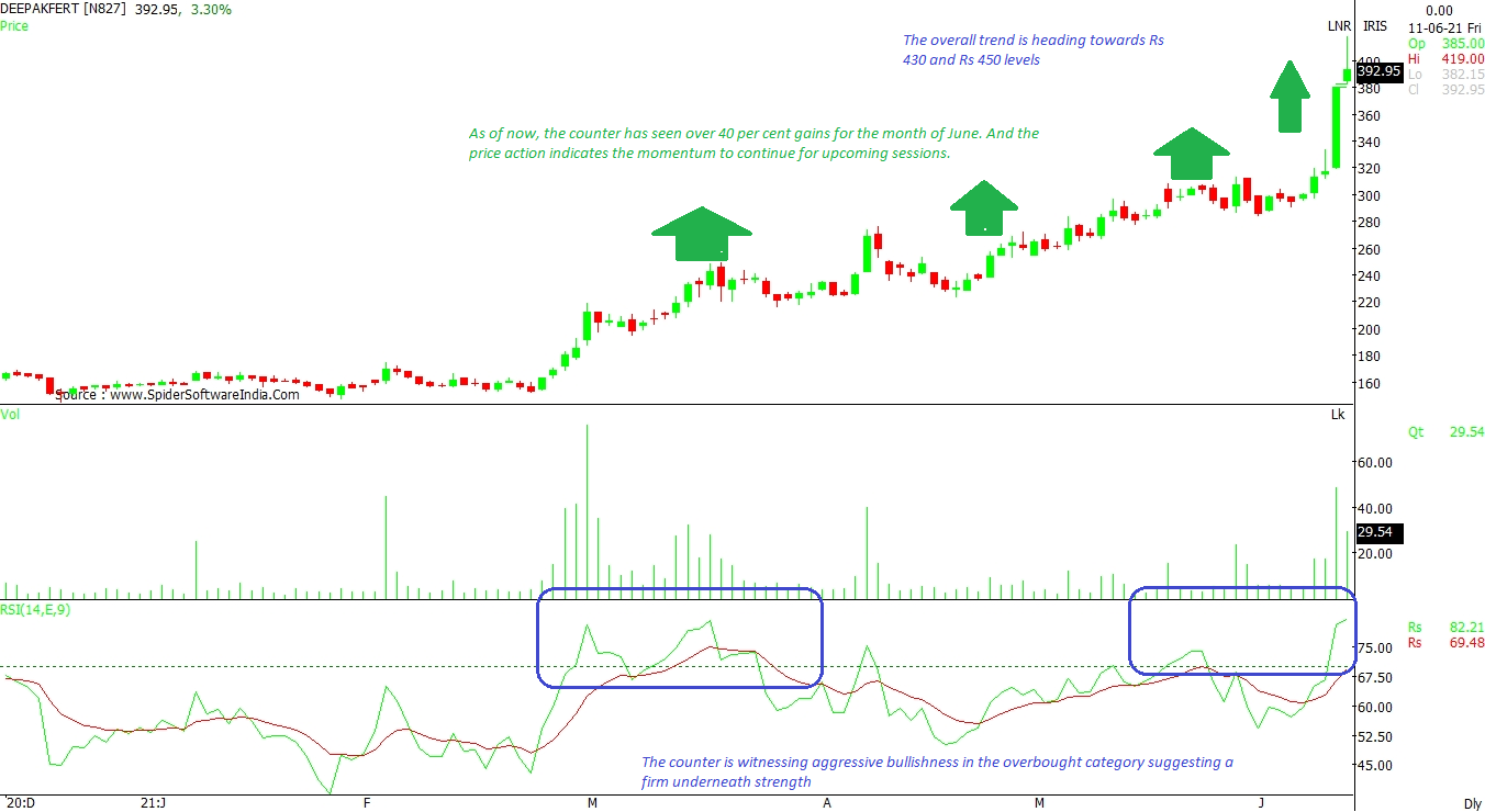 The stock has surged over 40 per cent so far in June and the price action indicates the momentum could continue for upcoming sessions. The overall trend is heading towards Rs 430 and Rs 450 levels, as per the daily chart. The immediate support comes at Rs 365 levels. The stock is witnessing aggressive bullishness in the overbought category suggesting a firm underneath strength. CLICK HERE FOR THE CHART