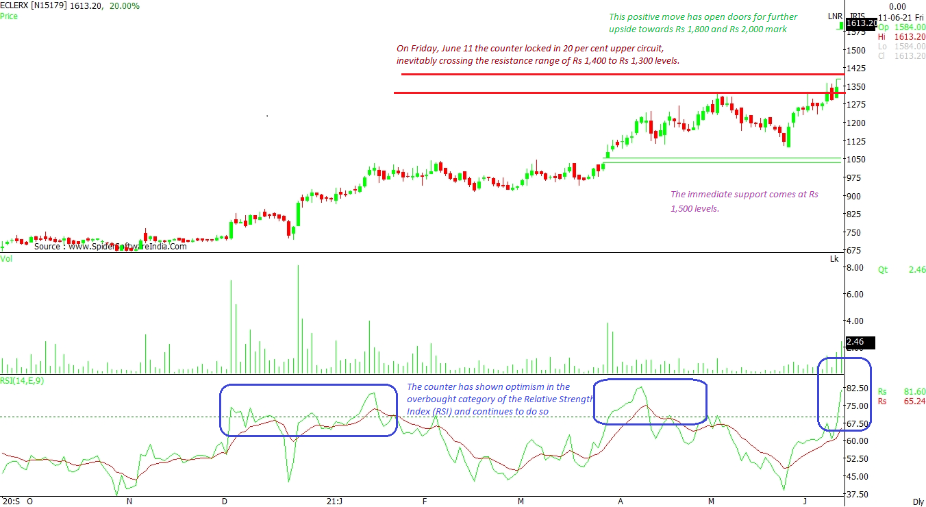 On Friday, June 11, the stock was locked in 20 per cent upper circuit, inevitably crossing the resistance range of Rs 1,400 to Rs 1,300 levels. This move has opened doors for further upside towards Rs 1,800 and Rs 2,000 mark, as per the daily chart. The stock has shown optimism even in the overbought category of the Relative Strength Index (RSI) and continues to do so. The immediate support comes at Rs 1,500 levels. CLICK HERE FOR THE CHART