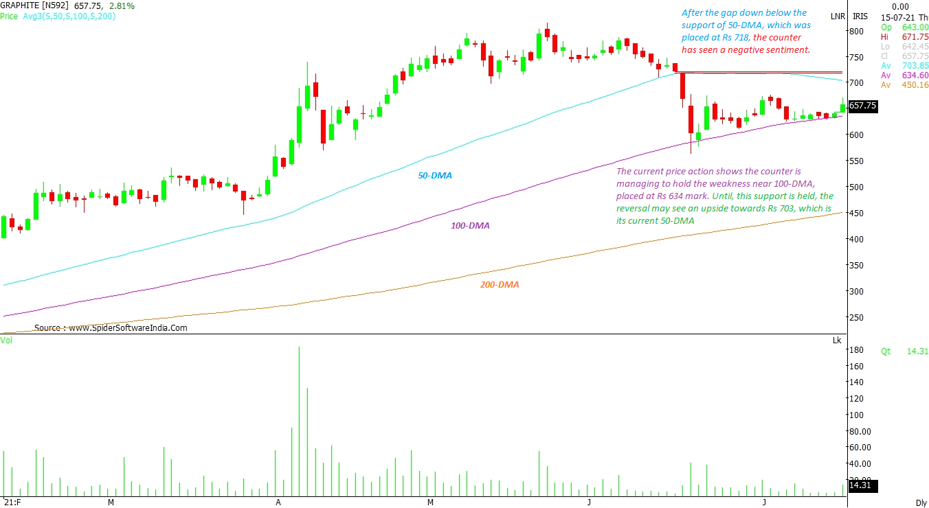 After the gap-down below the support of 50-DMA, which was placed at Rs 718, the counter had turned negative. The current price action shows the counter is somehow managing to hold the weakness near 100-DMA, placed at Rs 634 mark. Until, this support is held, there can be a reversal, which may see the stock move up to Rs 703 levels, which also is its 50-DMA, as per the daily chart. CLICK HERE FOR THE CHART