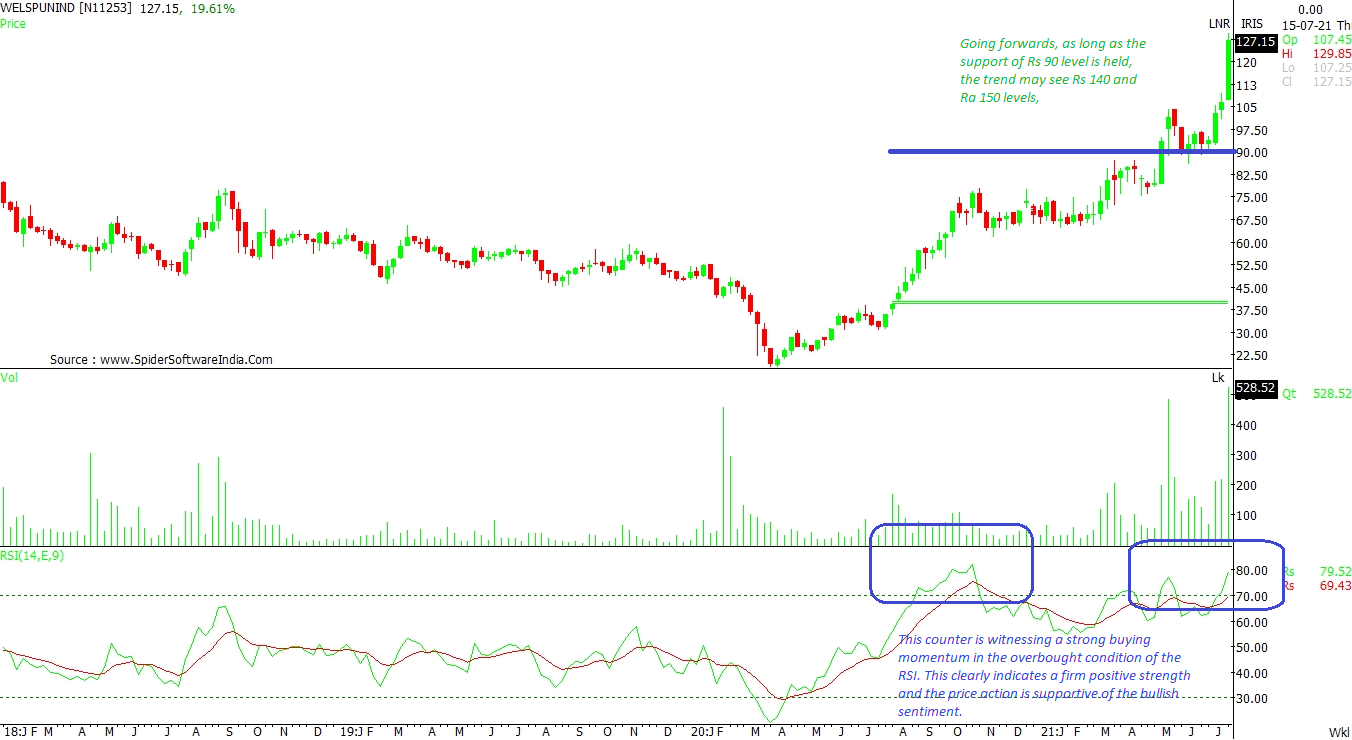 Welspun India is witnessing a strong buying momentum in the overbought condition of the RSI. This clearly indicates positive strength and the price action is supportive of the bullish sentiment. Going forward, as long as the support of Rs 90 is held, the stock may see Rs 140 and Ra 150 levels in the weeks ahead, chart suggests. CLICK HERE FOR THE CHART