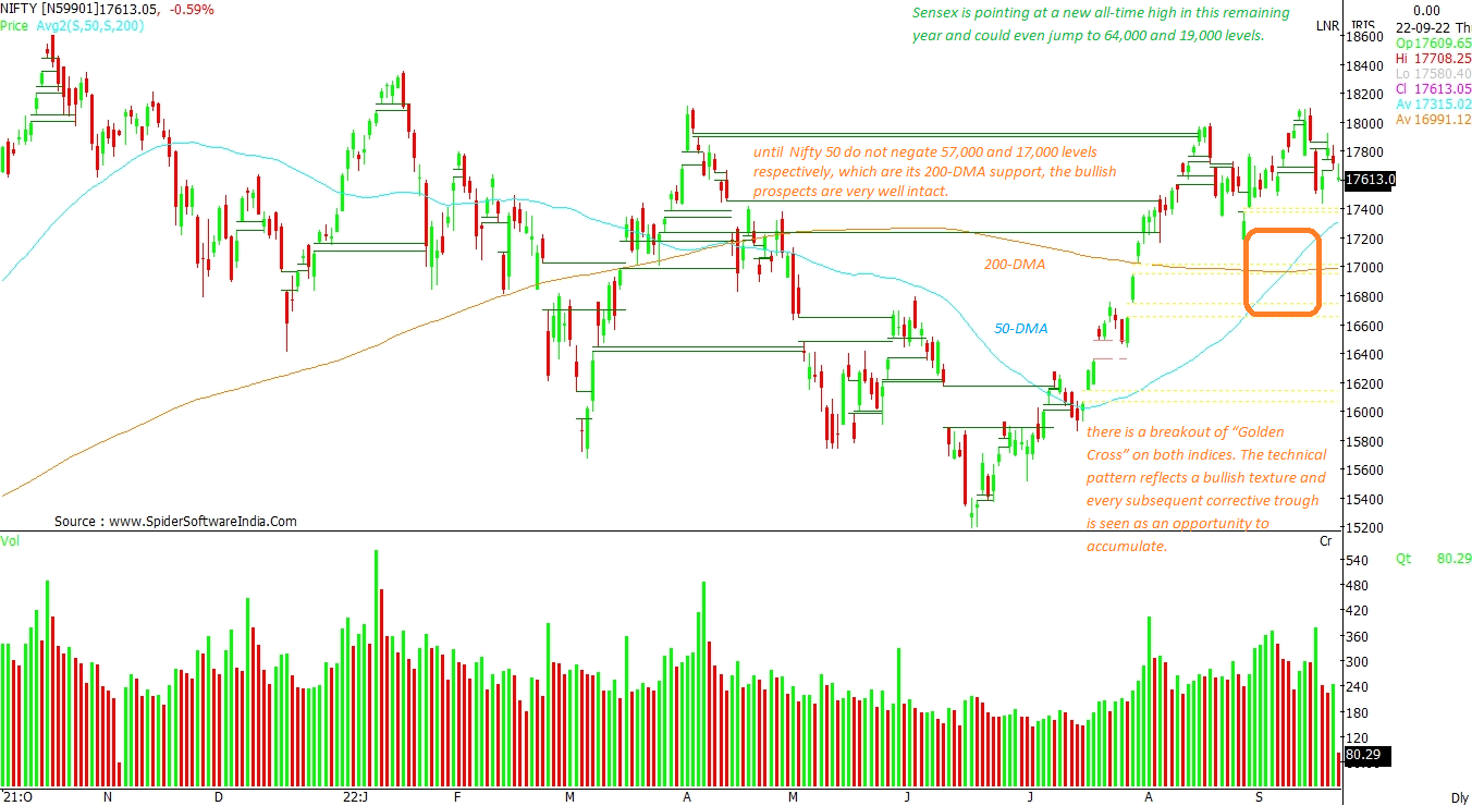 Until the S&P BSE Sensex and Nifty50 do not break 57,000 and 17,000 levels on good volume, which are also their respective 200-DMA supports, the bullish undertone remains intact. Even if the indices show sideways movement, the overall trend will remain in favour of bulls and a correction, if any, should be used to buy, analysts said. CLICK HERE FOR THE CHART