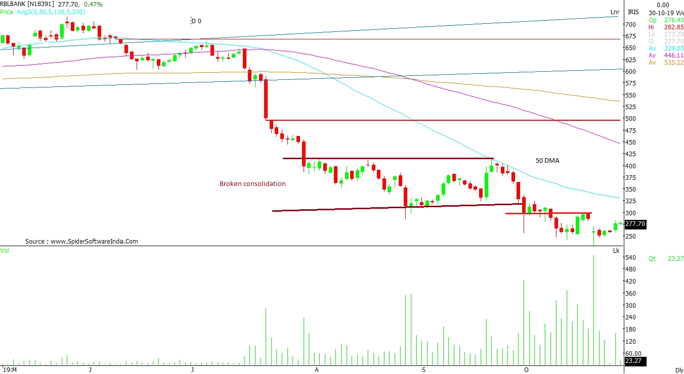 RBL Bank Ltd (RBLBANK): The selling pressure since July this year has been severe and destroyed the upside sentiment. It did try to consolidate in September; however, in the process it breached significant support resulting in more price disruption. It also witnessed resistance at 50-DMA in the same period. The counter has struggled to conquer Rs 300 in the recent trading sessions. CLICK TO VIEW CHART