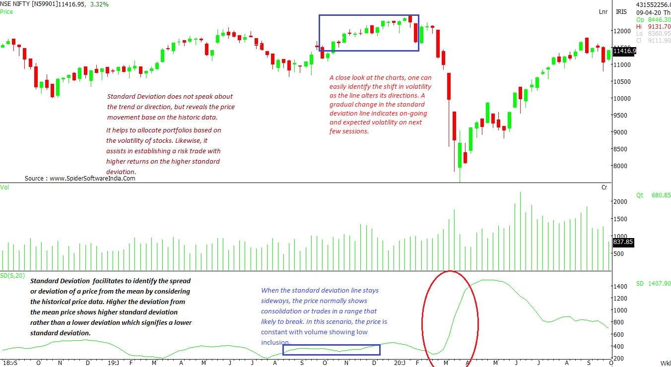 When combined with other momentum indicators like Moving Average Convergence Divergence (MACD) Relative Strength Index (RSI) or price indicators like Bollinger band, moving averages, candlestick pattern, chart pattern, the standard deviation has shown a strong relationship with the Bollinger Band and chart patterns. One can pre-empt the price move to conquer the upper band of Bollinger having strong volatility with standard deviation.