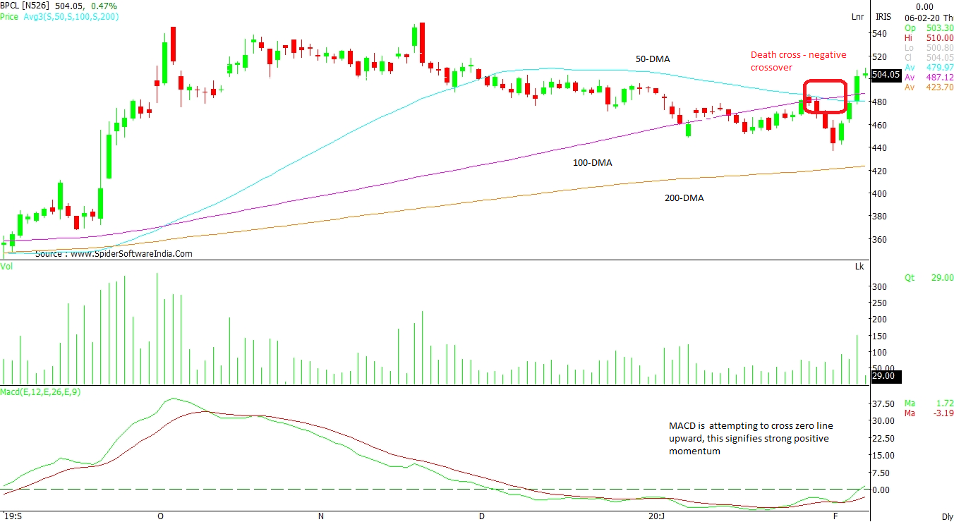 Bharat Petroleum Corporation Ltd (BPCL): Although, the counter has a negative crossover of 100-DMA with 50-DMA on the daily chart, it did not give a confirm breakdown. Now, as it has crossed 100-DMA upward, one can expect a further upside towards Rs 540 levels, which is the resistance level. The support remains at Rs 480 on closing basis. The Moving Average Convergence Divergence (MACD) is attempting to cross zero line upward, which signifies a strong positive momentum. CLICK HERE FOR THE CHART