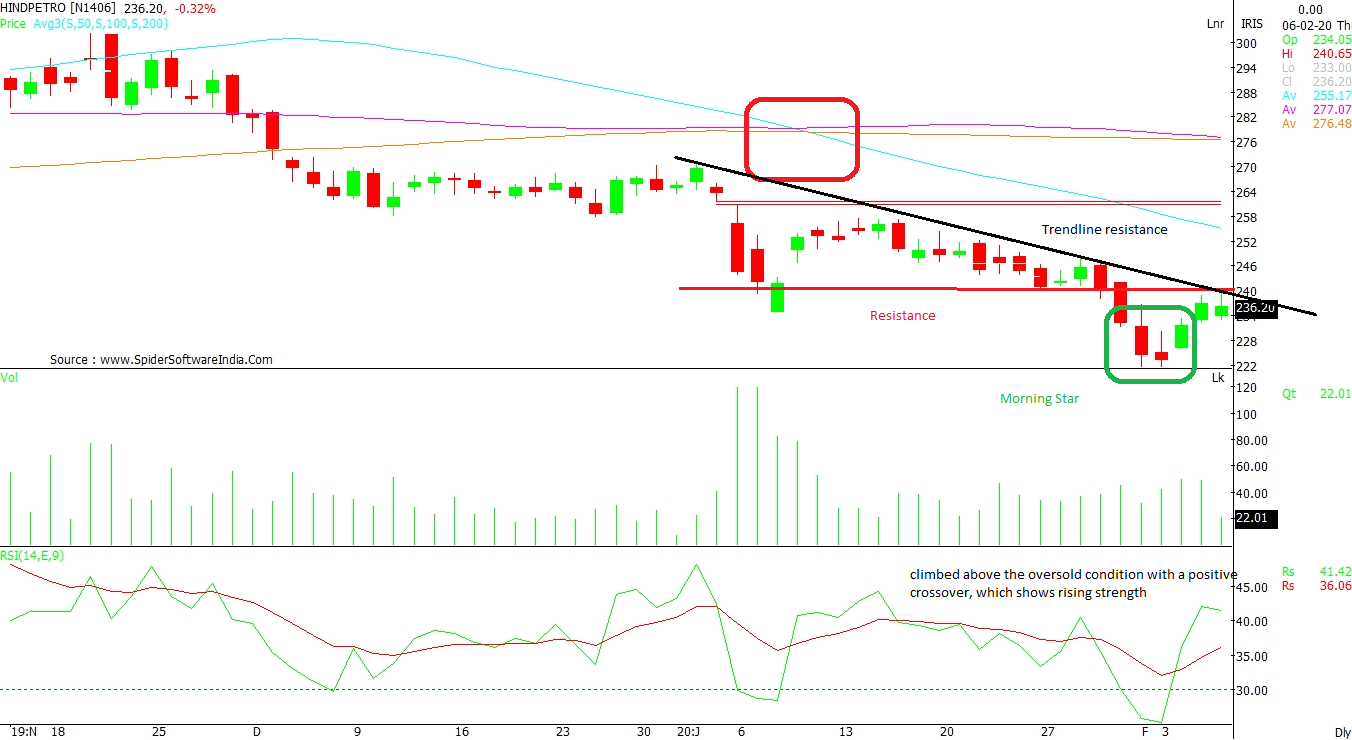 Hindustan Petroleum Corporation Ltd (HINDPETRO): A trend line resistance with price resistance at Rs 240 needs to be crossed on a closing basis to rally towards Rs 255, which is 50 DMA level. The overall trend indicates bullishness as the candlestick pattern of “Morning Star” suggests a positive sentiment as per daily chart. The RSI has climbed above the oversold condition with a positive crossover, which shows rising strength. CLICK HERE FOR THE CHART