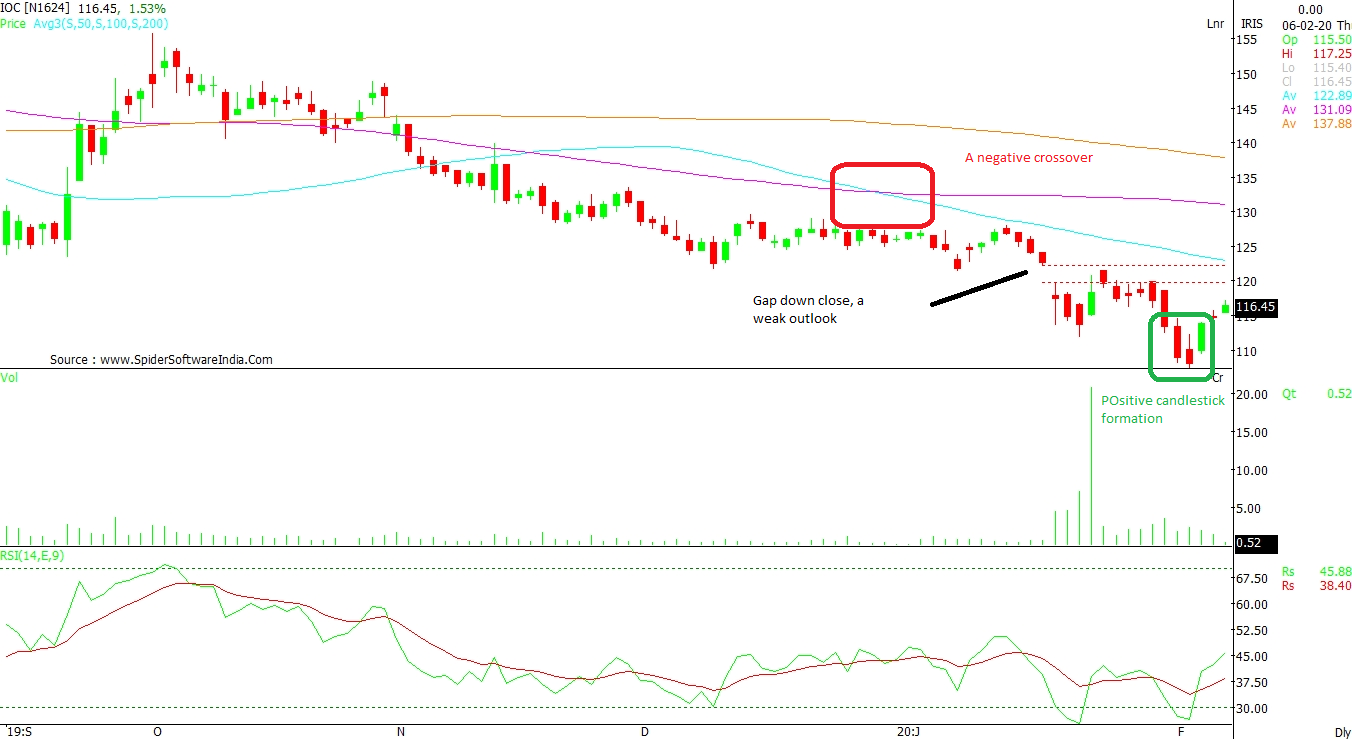 Indian Oil Corporation Ltd (IOC): A negative crossover of 50 DMA with 100 DMA followed by a gap-down has dampened the upside move of this counter as per daily chart. The major resistance stays at Rs 130 and unless this is not conquered, the medium-term trend remains negative. On an immediate scale, the trend seems positive the as Relative Strength Index (RSI) has climbed above the oversold territory. The volumes are not very supportive of a strong upside. However, a rally towards Rs 120 may be expected. The support remains at Rs 110 levels. CLICK HERE FOR THE CHART