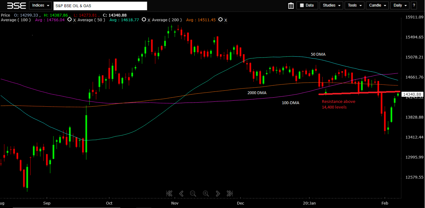 S&P BSE OIL & GAS index: The index is trading below its 200-days moving average (DMA) indicating a weak trend. Morevover, the negative crossover of the major moving averages shows selling pressure on subsequent reversals. The major resistance of 14,760 levels needs to be conquered to change the negative sentiment. The immediate resistance is above 14,400 levels. The support remains at 13,700 levels, as per daily chart. CLICK HERE FOR THE CHART
