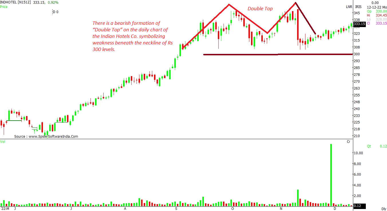 There is a bearish formation of "Double Top" on the daily chart of the Indian Hotels Co. symbolizing weakness beneath the neckline of Rs 300 levels. Thus, until this support mark is defended, the positive reversal could again see the stock resuming its upward trend. Furthermore, a breakout over the high of Double top, which, in this case, is Rs 348.45, could trigger a bullish upside towards Rs 400 levels.
