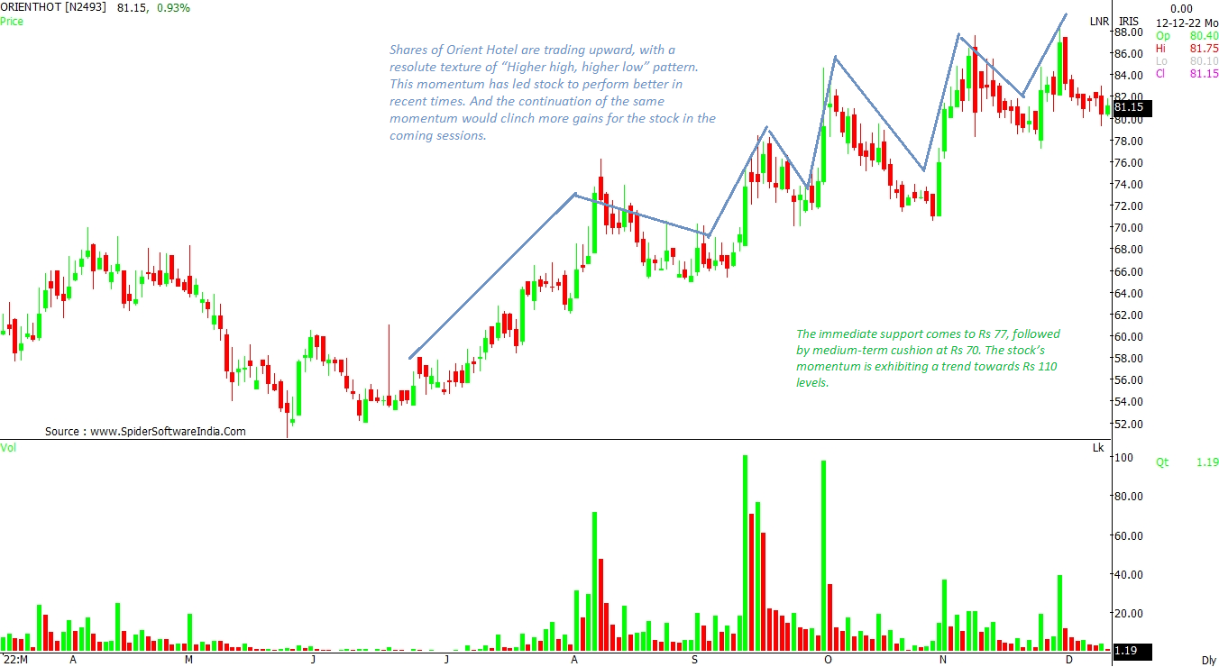 Shares of Orient Hotel are trading upwards with a resolute texture of "Higher high, higher low" pattern. This momentum has led stock to perform better in recent times. The immediate support comes at Rs 77, followed by medium-term cushion at Rs 70. The stock's momentum is exhibiting a trend towards Rs 110 levels.
