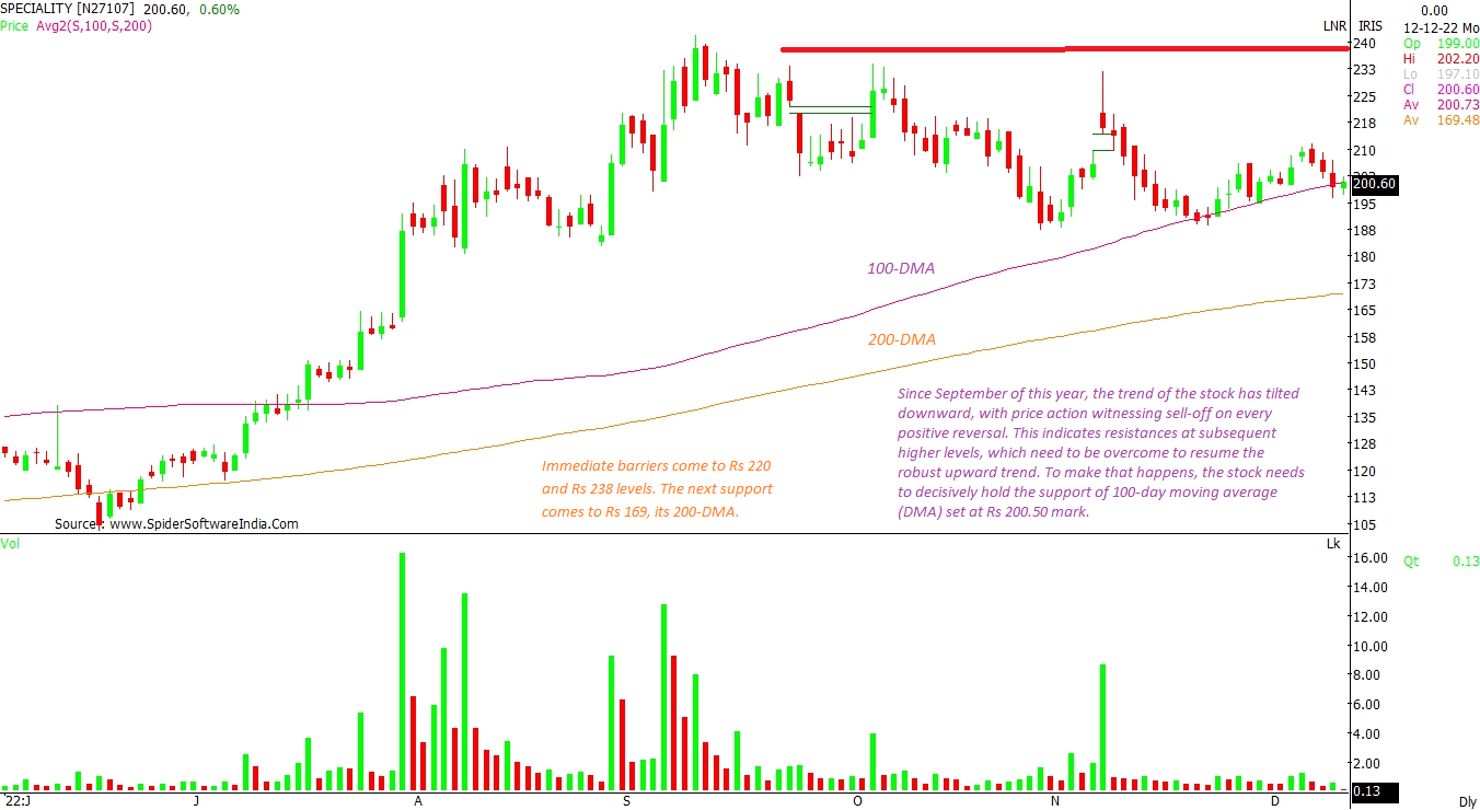 Since September 2022, the trend of the stock has tilted downwards, with price action witnessing sell-off on every positive reversal. This indicates resistances at subsequent higher levels, which needs to be overcome to resume the robust upward trend. To make that happens, the stock needs to decisively hold the support of 100-day moving average (DMA) set at Rs 200.50 mark. Immediate barriers come at Rs 220 and Rs 238 levels. The next support comes at Rs 169, its 200-DMA.