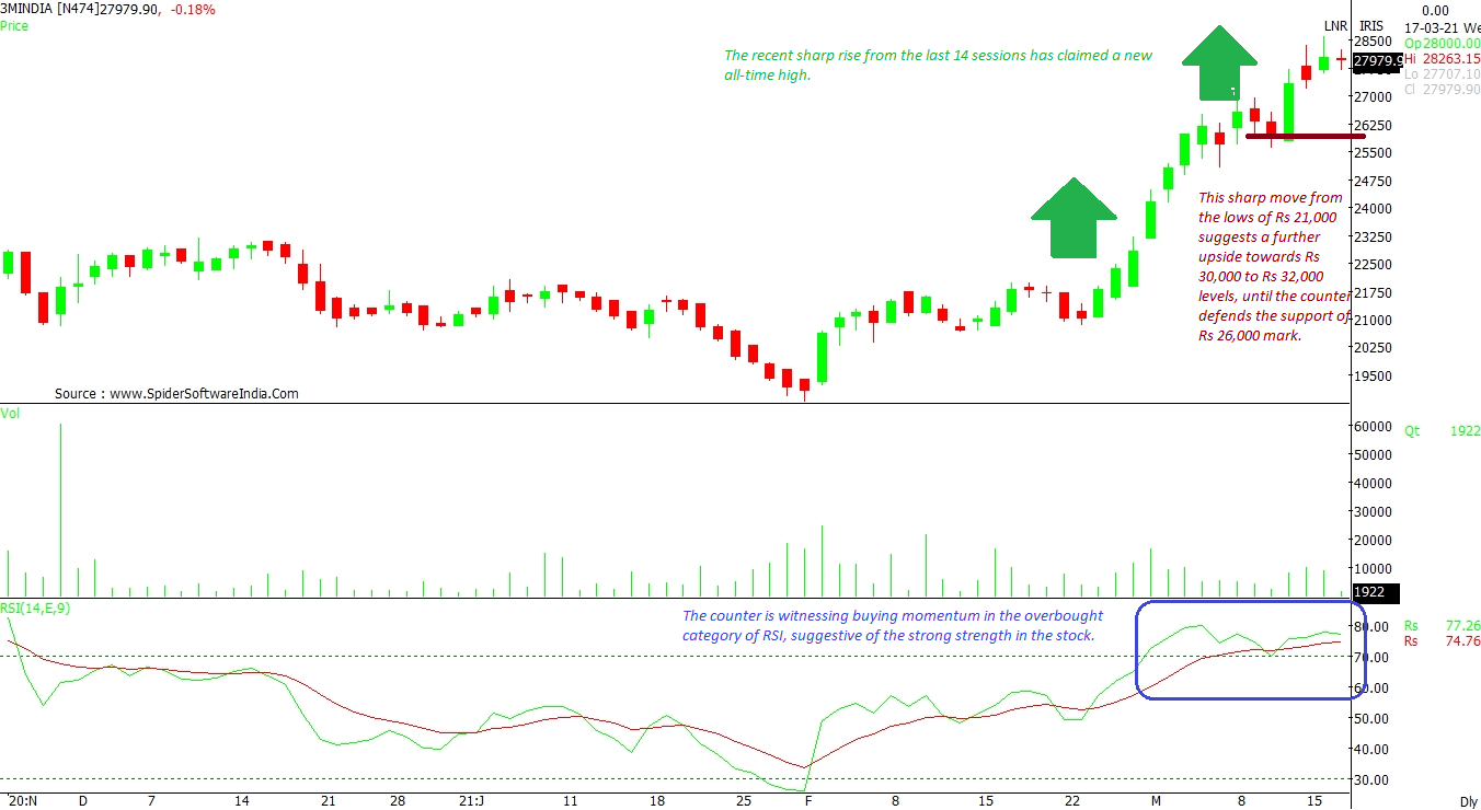 3M India Limited (3MINDIA): The sharp rise in the last 14 sessions has seen the counter hit an all-time high. This sharp move from the lows of Rs 21,000 levels suggests a further upside towards Rs 30,000 and then to Rs 32,000 levels. This will be possible if the counter is able to defend the support of Rs 26,000. 3M is witnessing buying momentum in the overbought category of Relative Strength Index (RSI), suggestive of the strong strength in the stock. CLICK HERE FOR THE CHART