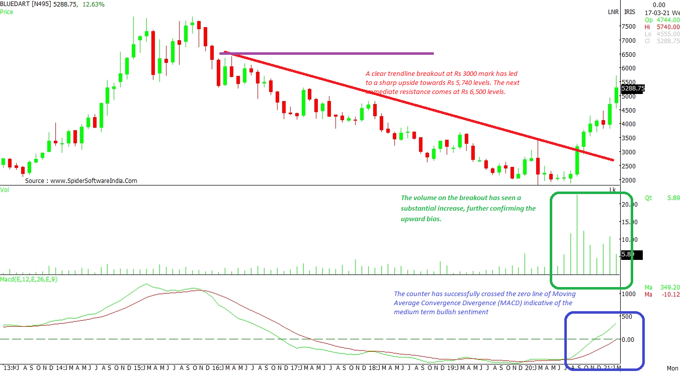 Blue Dart Express Limited (BLUEDART): A clear trendline breakout at Rs 3000 levels has led to a sharp upside towards Rs 5,740 levels. The next immediate resistance comes in at Rs 6,500 levels. The counter has successfully crossed the zero line of Moving Average Convergence Divergence (MACD), which is indicative of the medium-term bullish sentiment, as per the monthly chart. The volume on the breakout has seen a substantial increase, further confirming the upward bias. CLICK HERE FOR THE CHART