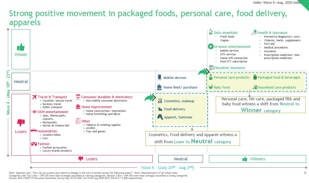 An August 2020 report by the Boston Consulting Group (BCG) said while essentials, health, in home entertainment continue to see an increase in consumption levels, there is an uptick in sentiment across many semi-essentials like personal care, packaged food as well as discretionary items like apparel, cosmetics, automobiles and consumer electronics. “Revival stronger among lower income segments and lower tier cities,” the BCG report said. CLICK HERE FOR THE GRAPHIC