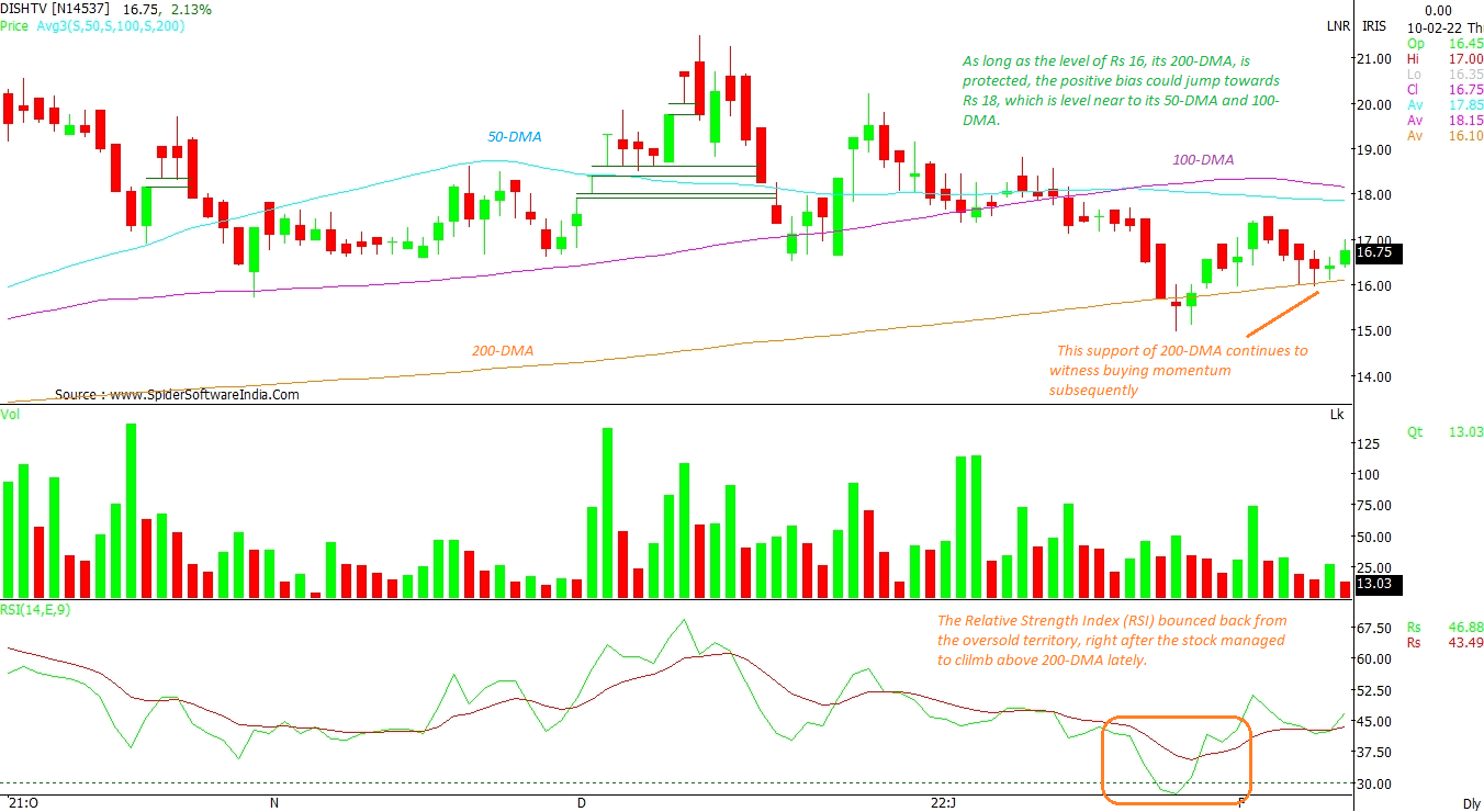 The Relative Strength Index (RSI) bounced back from the oversold territory, right after the stock managed to climb above the 200-DMA lately. This support of 200-DMA continues to witness buying momentum subsequently, according to the daily chart. Thus, as long as the level of Rs 16, its 200-DMA, is protected, the positive bias could jump towards Rs 18, which is level near to its 50-DMA and 100-DMA. CLICK HERE FOR THE CHART