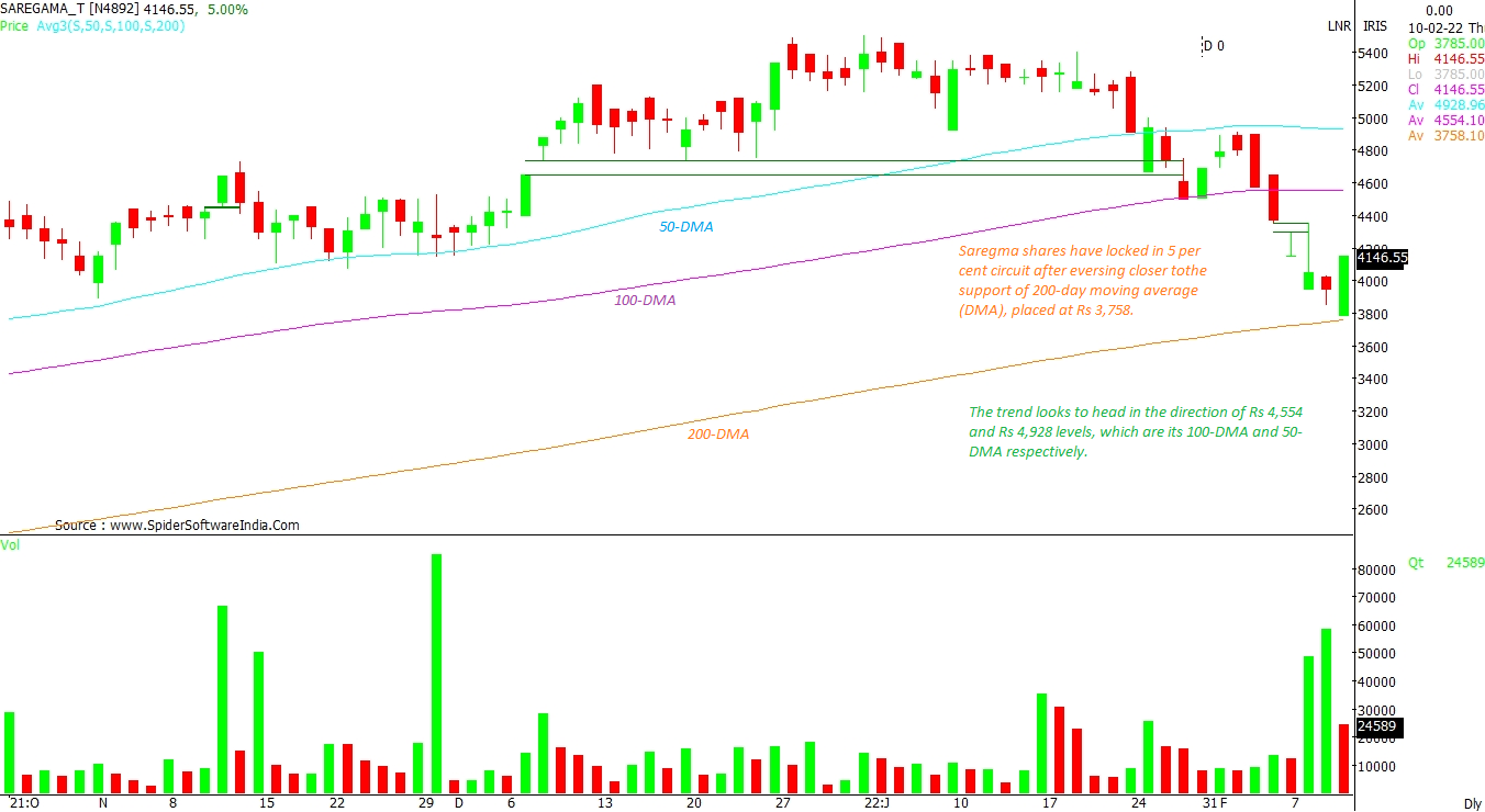 Saregma shares were locked at the 5 per cent upper circuit after trendig closer to the support of 200-day moving average (DMA), placed at Rs 3,758. The trend now looks headed in the direction of Rs 4,554 and Rs 4,928 levels, which are its 100-DMA and 50-DMA respectively. CLICK HERE FOR THE CHART