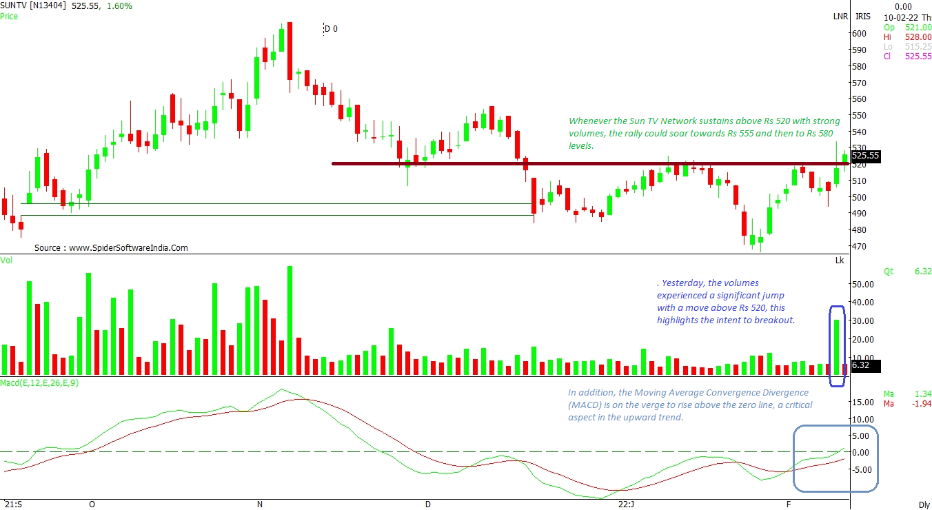 As and when Sun TV Network sustains above Rs 520 with strong volumes, the rally could triger a sharp move towards Rs 555 and then to Rs 580 levels. Yesterday, the volumes experienced a significant jump with a move above Rs 520, this highlights the intent of a breakout. In addition, the Moving Average Convergence Divergence (MACD) is on the verge to rise above the zero line, a critical aspect in the upward trend. CLICK HERE FOR THE CHART