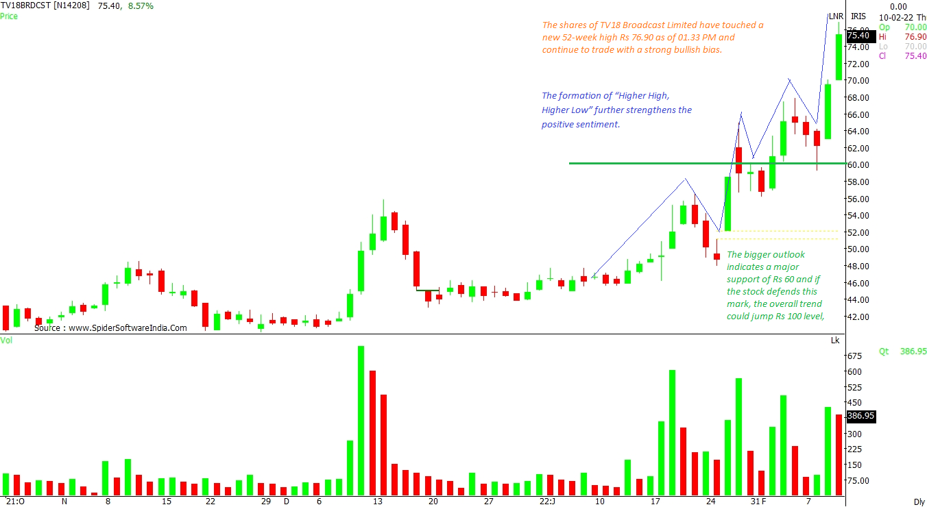 The shares of TV18 Broadcast Limited touched a new 52-week high in trades today and continue to trade with a strong bullish bias. The bigger outlook indicates major support for the stock at Rs 60 and if the stock defends this mark, the overall trend could provide a jump towards Rs 100 level, based on the daily chart. The formation of “Higher High, Higher Low” further strengthens the positive sentiment. CLICK HERE FOR THE CHART